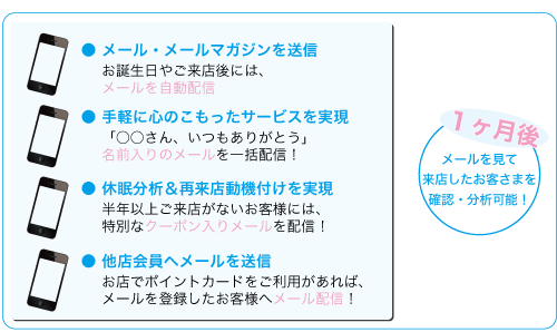メールアドレスの登録した自店会員へ、お買い得、イベント情報などのメールマガジンの配信や配信条件を対象を抽出した会員にメールを送ることも可能です。また、店舗で会員様にお楽しみ頂ける機能「抽選メール」、もらってうれしい「バースデーメール」などあります。